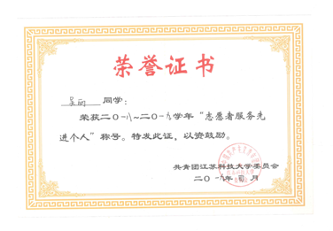 校“优秀共青团员”;校“三好学生”;校“优秀学生干部”;校暑期社会实践“先进个人”;人民奖学金“三等奖”等表彰若干。