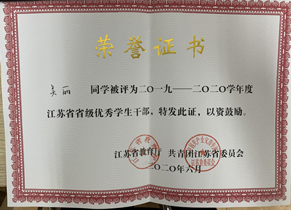 人民奖学金一等、团中央三下乡社会实践“千校千项”入选、扬中市暑期社会实践“优秀宣讲员”、校三好学生、校志愿服务先进个人、校优秀共青团员、院十佳青年等表彰若干。