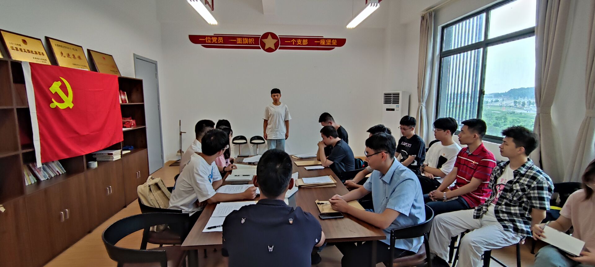 会议最后一个流程,由夏书记带领全体党员同志面对党旗再次宣读入党誓词,坚定共产主义信念,为共产主义事业奋斗终身。