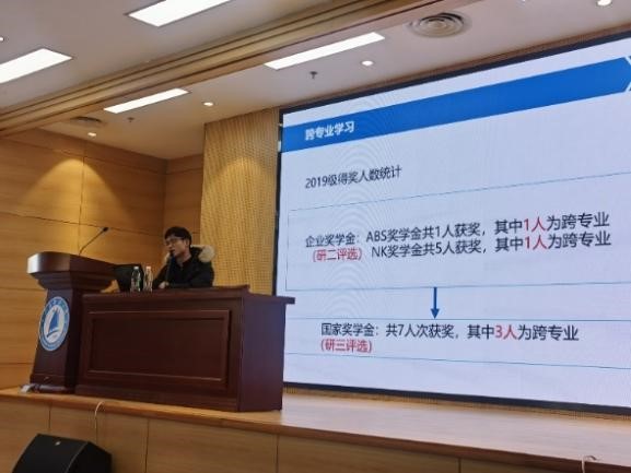 韩越同学作为优秀研究生代表就研究生的学习生活与同学们展开分享,韩越提到跨专业的同学获得奖学金的比例在逐步增大,意味着这部分同学只要通过自己努力,取得的成果不会逊色于本专业同学。韩越给研一同学提出了开始科研的几个步骤,第一步是要热爱学校,了解专业,明确目标。要多与同课题组的导师同学交流,和本科的同学交流,包括研究方向、就业去向等问题。要细读研究生手册,明确自己的目标。第二步是认真上课,自主补修,结伴交流。韩越推荐了江苏科技大学网络教学平台,供跨专业的同学们补修使用,并强调课题组内要多交流,多帮助,以形成良好的科研氛围。