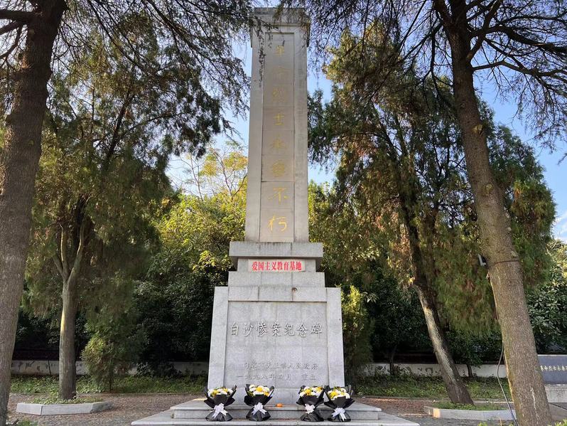 第二站,来到“白沙惨案纪念碑”爱国主义教育基地,一座革命烈士永垂不朽纪念碑屹立于此,党员师生们以满心的敬仰与崇高的敬畏,驻足凝视着纪念碑,深刻领悟了革命先烈们不畏死亡、坚守信仰的精神。