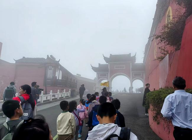 “第一福地,第八洞天”。第二站:茅山。在前往景区的路上,支部成员们为孩子讲解了茅山的历史与文化,特别是它与新四军的渊源,激发了他们对即将参观的景点的期待。抵达茅山后,大家首先来到主要景区九霄万福宫。在讲解员的解说下,孩子们了解了万福宫的历史及其在中国传统文化中道教的重要地位。当日雾气弥漫,九霄万福宫内的氛围让孩子们更加深刻地感受到道家修身养性的意境。党员们看到孩子们眼中的惊奇与敬畏,也更加理解这种文化的传承与启蒙,正是我们这一代人的责任。