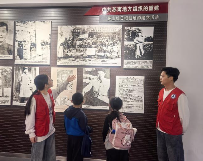 “碑下放鞭炮,空中响军号”。第三站:在参观茅山新四军纪念馆,带领孩子们前往苏南抗战胜利纪念碑,这是为了铭记新四军与苏南人民在抗战期间浴血奋战的历史而建立的。站在碑下,孩子们深刻感受到了那段悲壮而光辉的岁月,在碑下放鞭炮,空中响起的军号声形成了一种奇特的现象,被誉为“世界一绝”。与茅山新四军纪念馆景点相距不远,大家步行前往,在馆内党员们为孩子详细介绍了新四军在抗日战争中的艰苦历程与英雄事迹,让孩子们明白了当年战士们所付出的牺牲与努力,通过这样的互动,不仅让孩子们了解历史,也让我们共产党员心中再次巩固了对先辈们的敬仰与崇敬。
