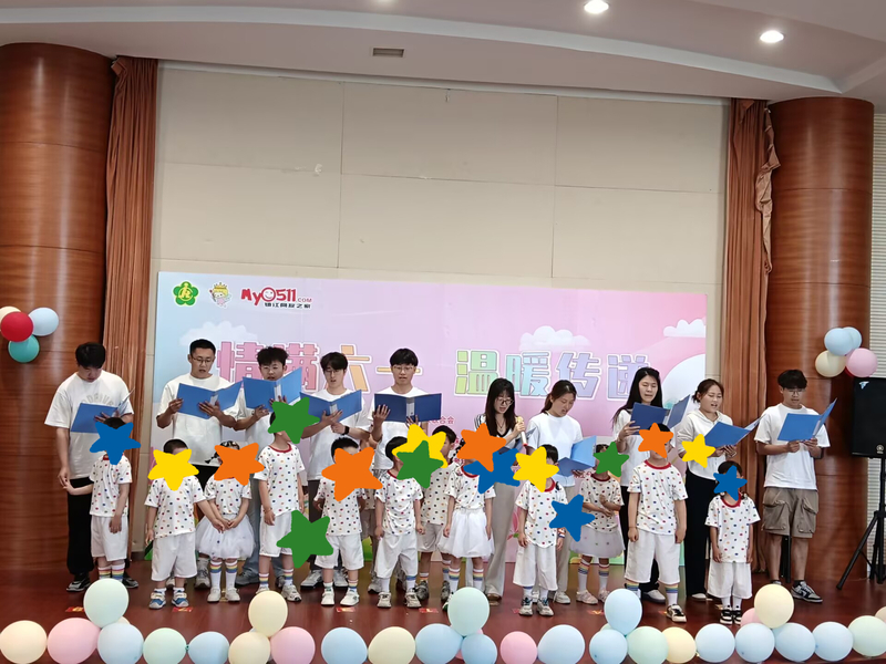 作为“青年船长领航工程”的重要实践,研究生团队不仅担任活动志愿者,更深度参与节目编排。在游戏互动区,“小马接力赛”“顶气球赛”等环节中,研究生们蹲下身与孩子们耐心协作,用鼓励化解紧张。活动尾声,研究生骨干们献上合唱《小美满》。轻柔的歌声中,孩子们一同轻声跟唱,部分孩子牵着志愿者的手轻轻摇摆。这份跨越障碍的情感共鸣,成为节日最动人的注脚。