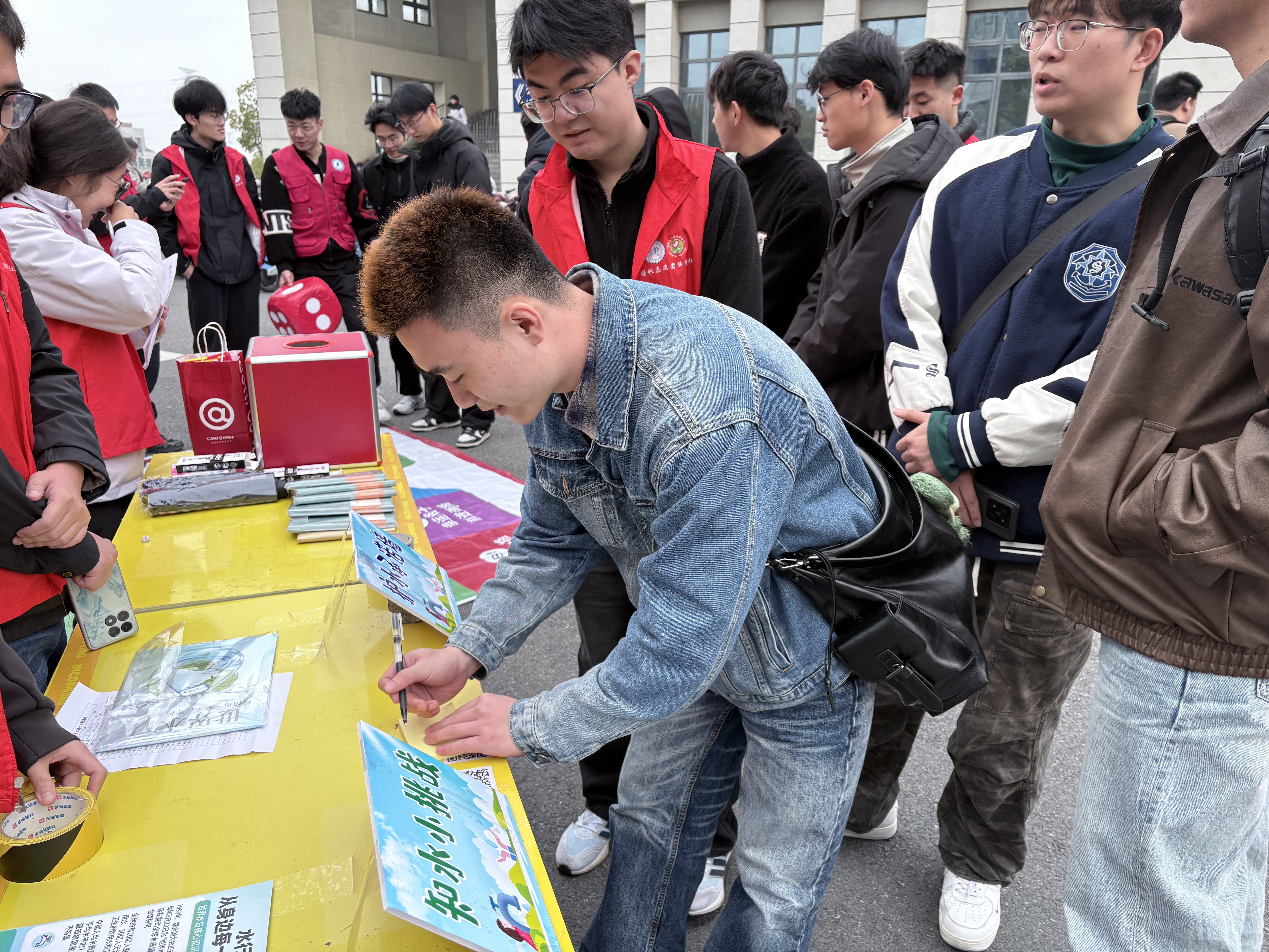 活动现场设置五大特色体验区,将知识科普与趣味游戏深度融合。“知水小挑战”答题区人气十足,师生扫码即可参与答题,5道题目包含基础节水常识与江苏本地水资源省情、校情内容,让大家在答题中快速掌握实用节水知识。一旁的“节水大富翁”游戏区更是排起长队,参与者投掷巨型骰子,在地面铺设的大幅地图上前进,根据格子提示完成“说出3个校园节水小技巧”“模仿节水动作拍照”“领取节水宣传页”等小任务,轻松活泼的形式让节水知识变得可感可知。